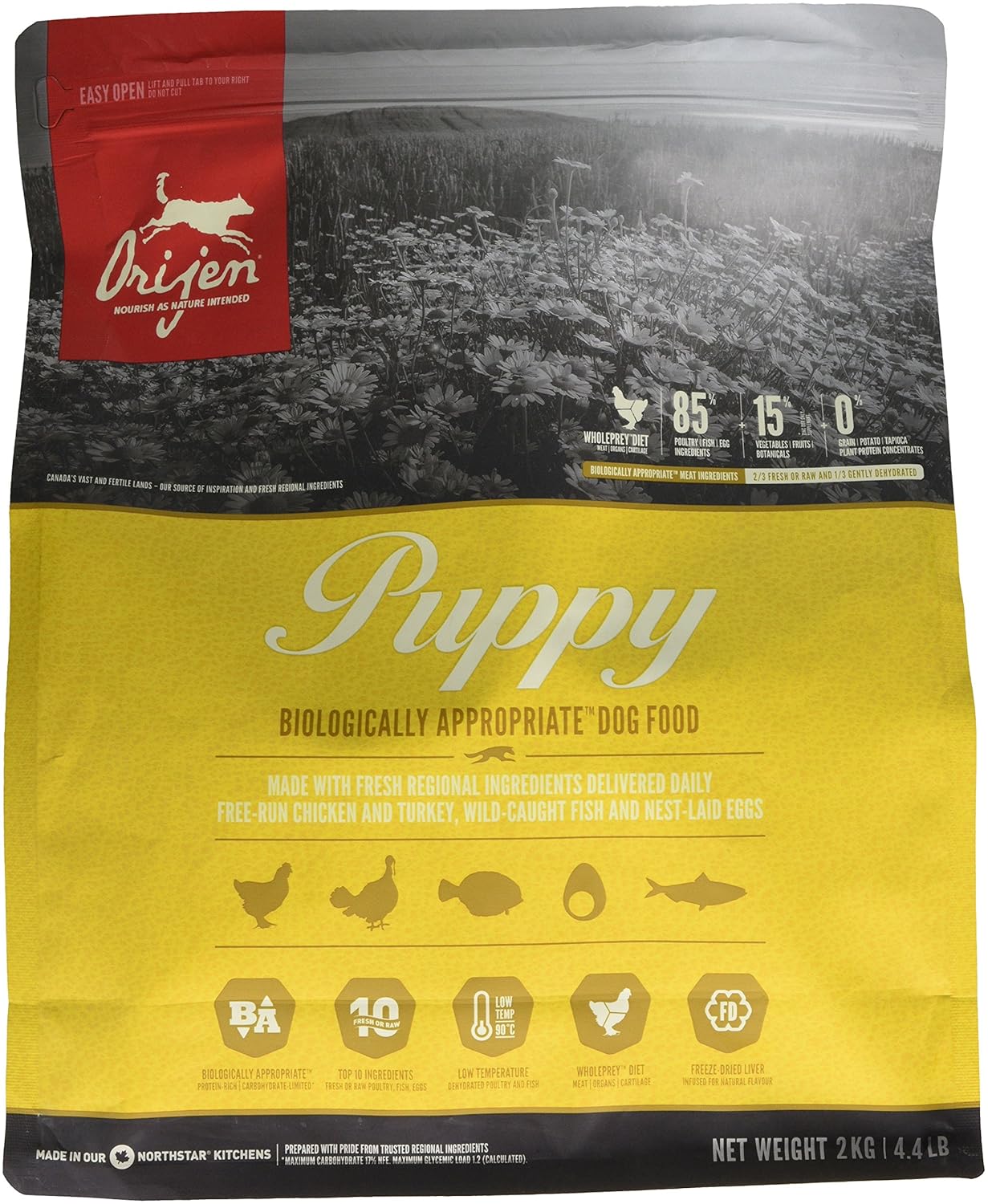 Orijen dog foods include a variety of premium quality protein sources including alberta lamb heritage pork nest laid eggs free run cobb chicken and wild caught freshwater and saltwater fish. Your questions answered. Orijen canada is a grain free dry dog food using a generous amount of named meats and organs as its main source of animal protein thus earning the brand 5 stars. Orijen dog and cat foods are crafted with up to 90 fresh and raw animal protein.